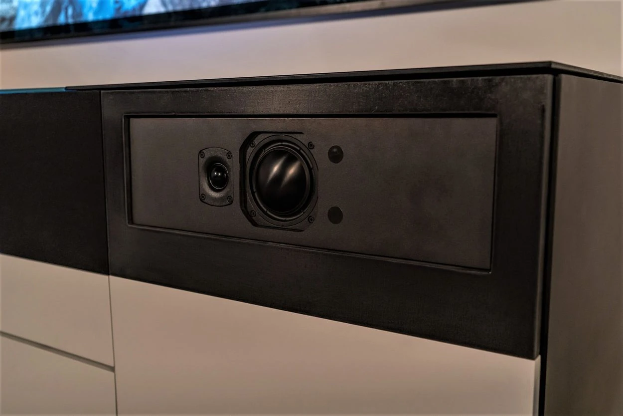 Since the projector uses the space normally reserved for a center-channel speaker, we had to create a better solution. Other projector cabinets lower the center-speaker compartment below the projector compartment. This doesn’t work well because sound now shoots under the coffee table. But we have an answer…. Aegis partnered with Next Level Acoustics and patented the first ever high-performance built-in speaker door. The specially designed speaker is mounted inside the door, extending just 1.35” into the projector compartment. This allows the center speaker to be properly placed in front of the projector inside.