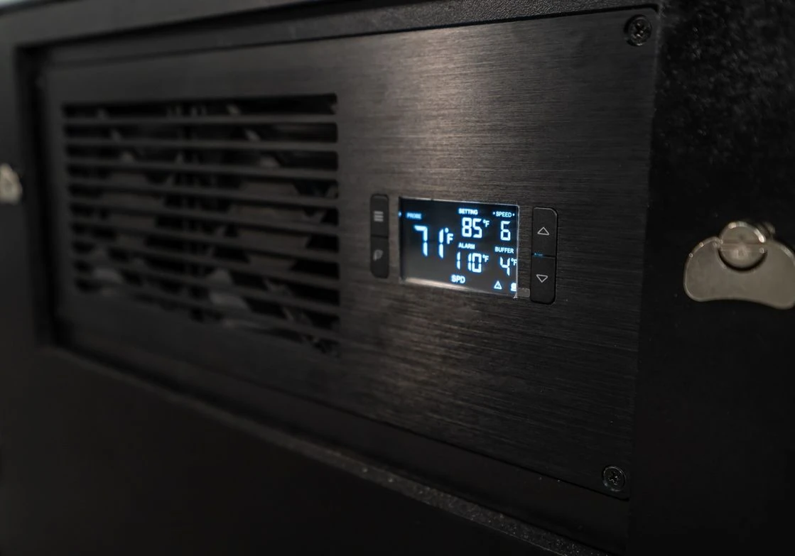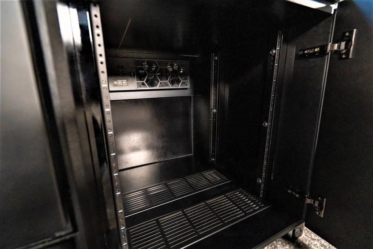 We don’t just add fans to cabinets, we’ve carefully engineered where to place our fans to promote optimal natural convection. Cool air is sucked through the filters in the air vents below equipment, and hot air is exhausted out. This allows your equipment to be pushed to its limits, deliver its full potential and last longer. Each AV compartment has foam weather stripping that seals the AV compartment from sucking dust in through door gaps. Simply set the temperature threshold to maintain optimal climate inside the sealed compartment that only sucks air in through the filters below. Each compartment is individually controlled and monitored with a temperature probe. Aegis uses premium ultra-low dBm fans that are optimally placed to exhaust heat and reduce noise. The Smart Feature takes noise reduction a step further and slowly increases the RPM’s of the fans only as needed as the AV compartment temperature climbs to the temperature threshold.