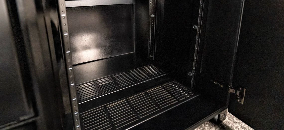The Aegis rack mounting system helps organize your equipment and is the preferred technique among AV integrators. Mounted to high-gloss black, aluminum rails, we’ve increased the breathing room between equipment for better air flow. We offer not only front, but also rear-facing rack mounting for shallow depth equipment and lacing bars. Wire management is built in as well. That closet wasn’t made for an ugly AV rack! Aegis Cabinets can safely hold and provide cooling for more than 40 U’s of AV equipment safely, beautifully and more effectively.