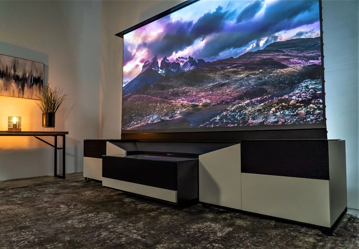 Aegis AV Cabinets developed and patented the first ever fully automated, cooled, and motorized Ultra Short Throw (UST) projector cabinet. and took it one step further with the all new Andromeda that is equipped with a hidden 120" (Four 60" TV's) rising UST/ALR screen. Glass is attached to the top of the screen so that when shut, it has a flush clean look. With the sound of your voice, tell Google or Alexa to turn on to become immersed in 120" 4k projection cinema with built in high performance sound in 30 seconds. With safety being our primary concern, aegis wanted to make sure that in the event a child or person puts a hand or fingers in the way when the screen is closing, no harm can come. Instead of hard connect the glass... we velcro'd it! In addition to the glass being flexible, velcroing the glass to the screen allows the glass to temporarily separate to prevent injury. Once they pull their hand out, the glass will fall back into place and re attach. Screen cassettes are firmly secured inside the housing bay of the cabinet. In the event a child or person pulls on the screen, it will not fall forward and cause injury.